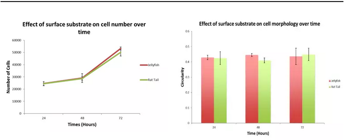 細(xì)胞培養(yǎng)72h結(jié)果顯示,在水母膠原(紅)上生長的細(xì)胞與在大鼠尾膠原(綠)上生長的細(xì)胞,細(xì)胞增殖水平和細(xì)胞形態(tài)接近。Jellagen是哺乳動物膠原蛋白良好的替代物。