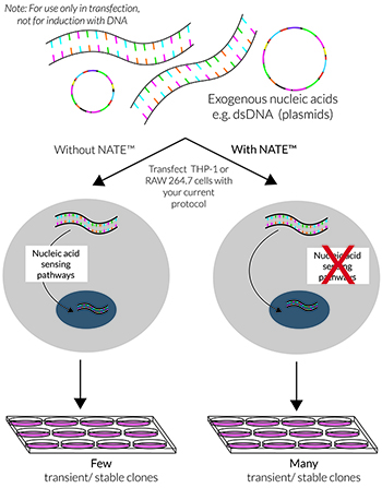 在真核細胞轉染期間,外源核酸(如質粒DNA)的主要障礙是它們會被胞質傳感器檢測,如cGAS/STING,AIM2炎癥小體和LC3介導的自噬。這些防御性級聯信號的激活通常會導致低轉染效率、降低的細胞活力和不一致的結果,尤其是在難轉細胞(如免疫細胞)的轉染實驗中。NATE?抑制許多核酸感應途徑,從而保護外源DNA并促進其表達。