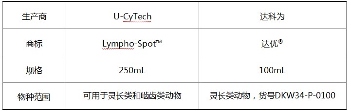 目前,我們同時提供U-CyTech原產的Lympho-Spot?無血清培養基和U-CyTech授權達科為在國內生產的達優?無血清培養基。它們的原料來源與質控標準完全相同,能獲得同樣出色的檢測結果。由于物種的差異,部分添加成分在靈長類和嚙齒類之間有差別。U-CyTech公司采取了同時添加的策略,所以生產出的是通用達優?無血清培養基;達科為公司采取的是分別添加的策略,所以生產出的是專用達優?無血清培養基,分靈長類和嚙齒類兩個品種。詳細的差別見下表。